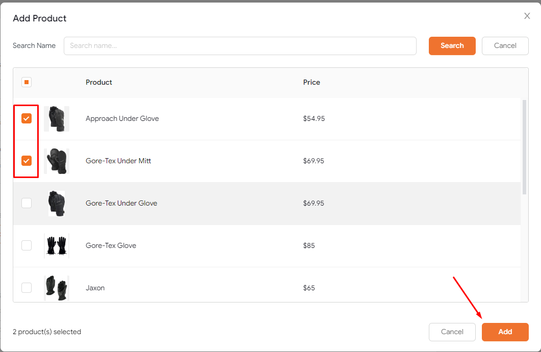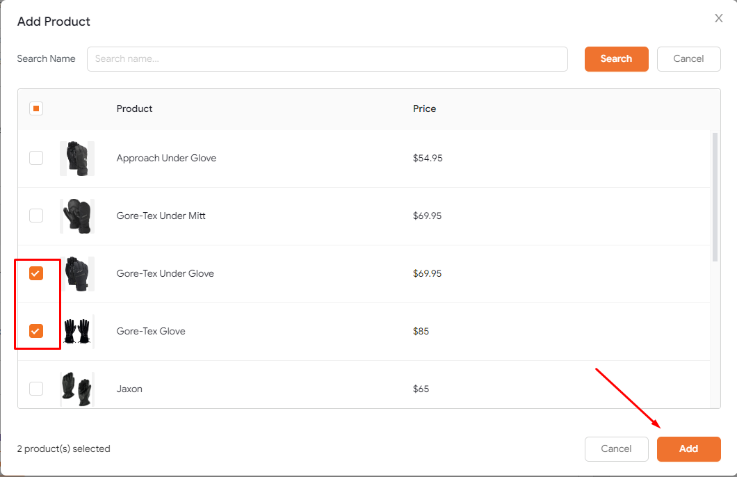 - Check boxes to select specific products
